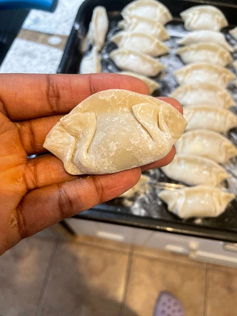 The Dumpling sheets came in a pack of 60. I made 30 for the first night and watched different YouTube videos to help me fold the dumplings properly. There are so many ways to fold, but I chose the easiest one for now!