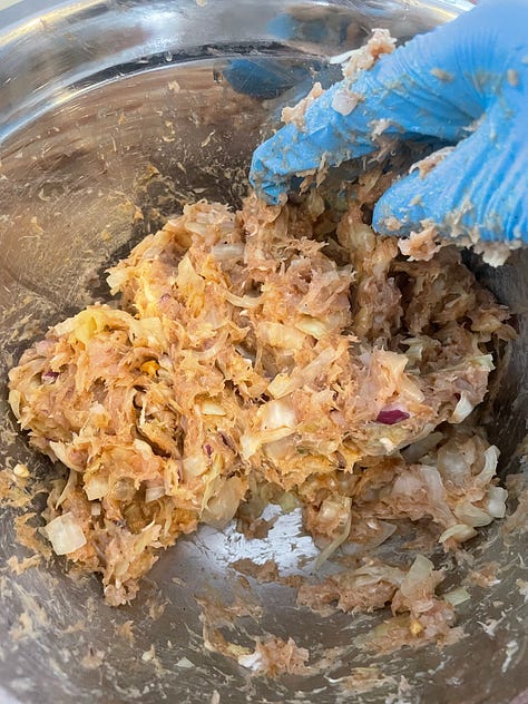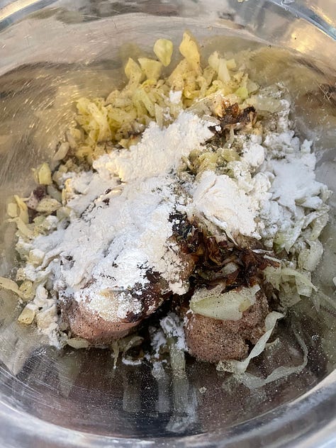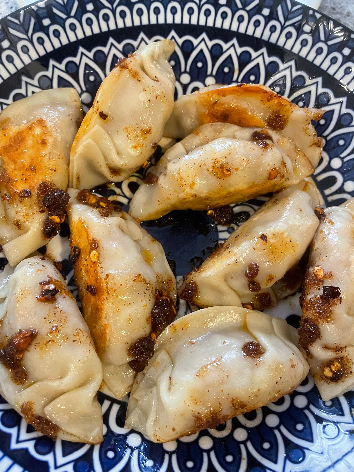 I bought the dumpling sheets premade to save some time and used Japanese Gyoza recipe to help me with the filling. I don’t eat pork, so I substituted for chicken, and followed the important things like soaking the cabbage in salt and squeezing out the water, adding the sesame oil and soy sauce (mushroom for me).